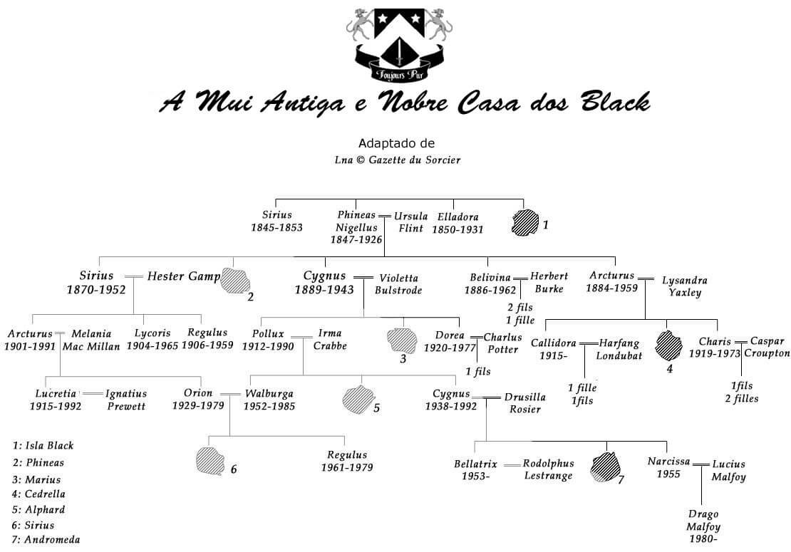 Talvez a mais antiga e tradicional família bruxa puro-sangue dos livros de Harry Potter, os Black, tem relação com inúmeras famílias de bruxos britânicas. Sua árvore genealógica é mencionada em Harry Potter e a Ordem da Fenix.
