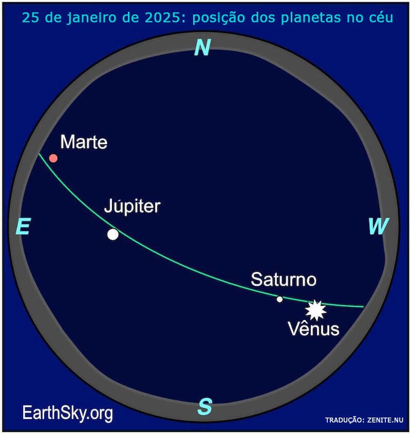 Bem, a olho nu nós só podemos ver cinco planetas: Mercúrio, Vênus, Marte, Júpiter e Saturno. Em janeiro de 2025 (e em praticamente todo o mês, não somente no dia 25) os planetas Marte, Júpiter, Vênus e Saturno podem ser vistos numa linha ao longo do céu. Entre Vênus e Júpiter, os mais brilhantes, ainda se posicionarão Netuno e Urano, visíveis apenas com algum instrumento astronômico.