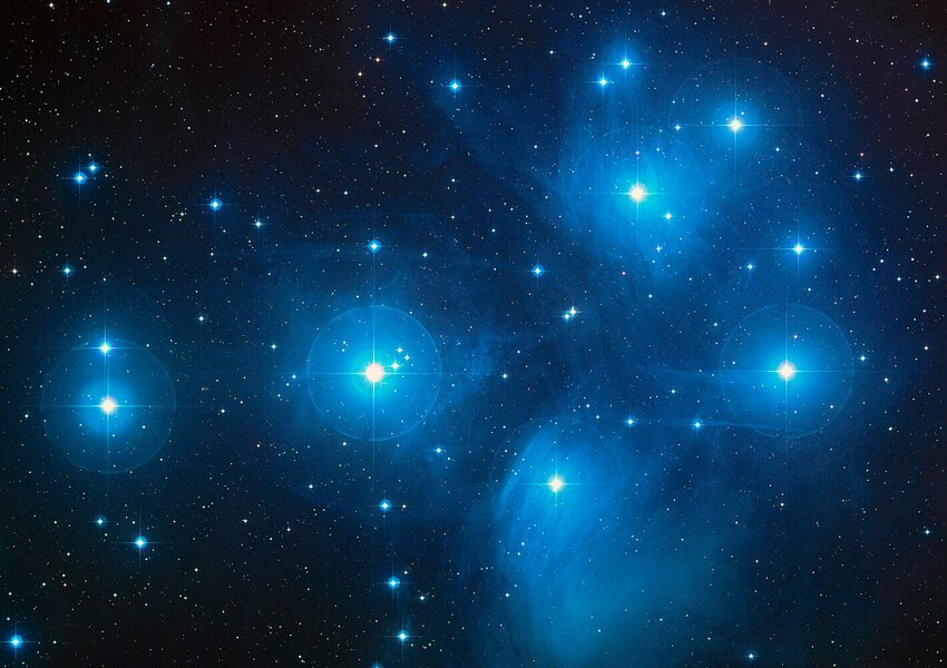 AGLOMERADO ABERTO das Plêiades, também conhecido como Messier 45 (M45). Foto: NASA, ESA, AURA/Caltech, Palomar.